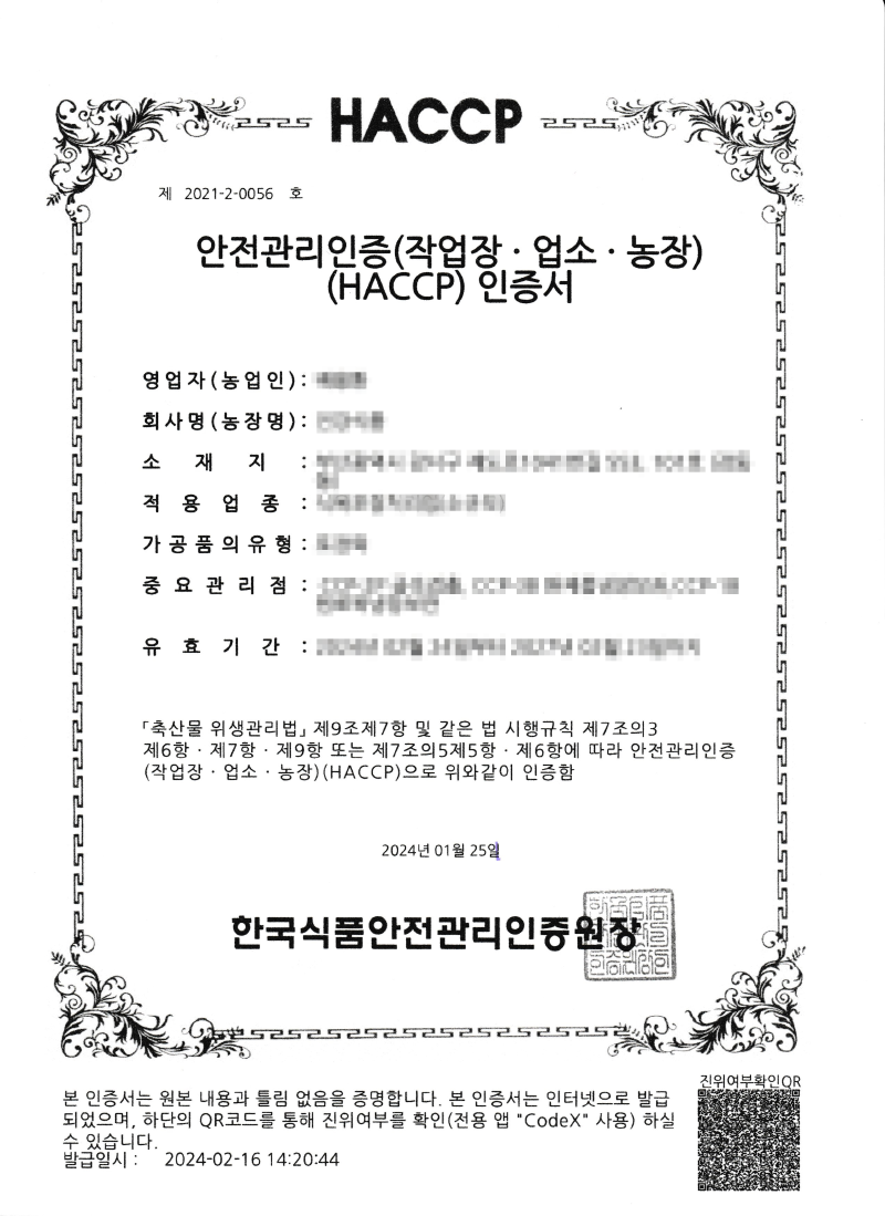 안전한 먹거리를 위해 HACCP 인증받은 안전하고 깨끗한 시설에서